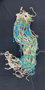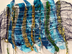 2023Weefwerk geinspireerd op de blauwe lucht. Geweven met zelfgesponnen draden. Op een frame
